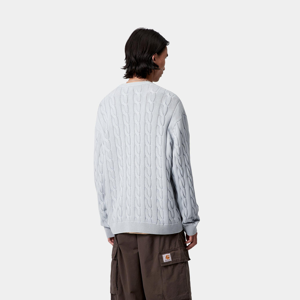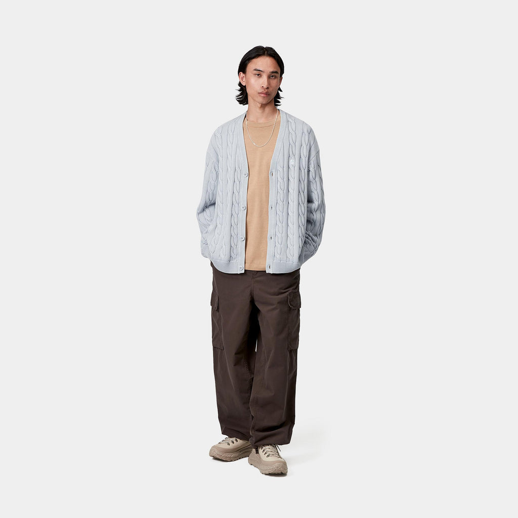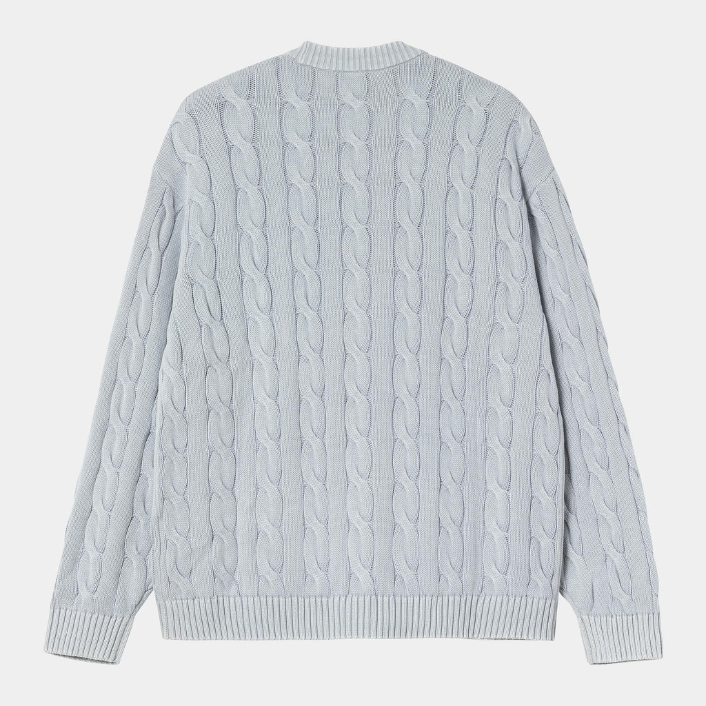 The Carter Cardigan is a midweight, cable-knit style made from cotton yarn. An embroidered 'C' Logo appears on the chest.