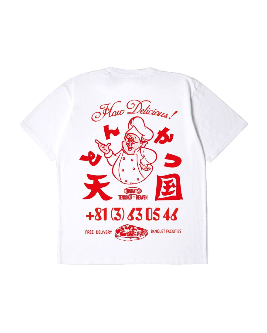 The EDWIN Tonkatsu T-Shirt is made from 160g/m² single jersey, 100% cotton. It features an oversized fit, graphic prints on both chest and back, and a ribbed collar for added durability and structure.